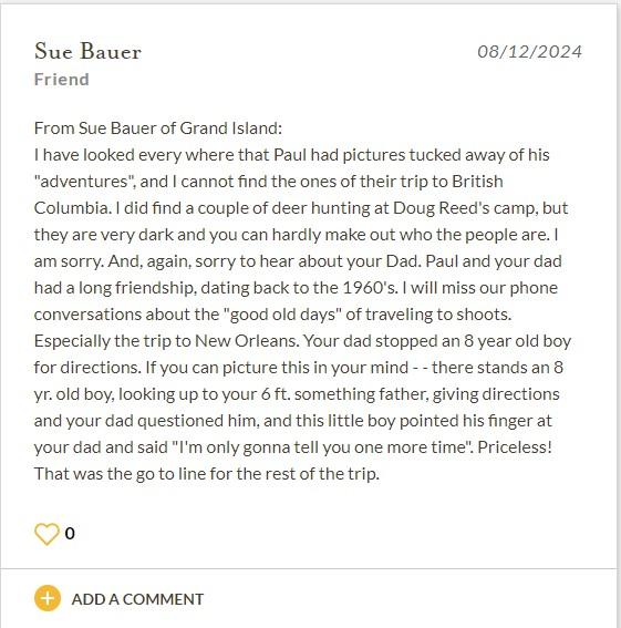 I have looked every where that Paul had pictures tucked away of his "adventures", and I cannot find the ones of their trip to British Columbia. I did find a couple of deer hunting at Doug Reed's camp, but they are very dark and you can hardly make out who the people are. I am sorry. And, again, sorry to hear about your Dad. Paul and your dad had a long friendship, dating back to the 1960's. I will miss our phone conversations about the "good old days" of traveling to shoots. Especially the trip to New Orleans. Your dad stopped an 8 year old boy for directions. If you can picture this in your mind – – there stands an 8 yr. old boy, looking up to your 6 ft. something father, giving directions and your dad questioned him, and this little boy pointed his finger at your dad and said "I'm only gonna tell you one more time". Priceless! That was the go to line for the rest of the trip.